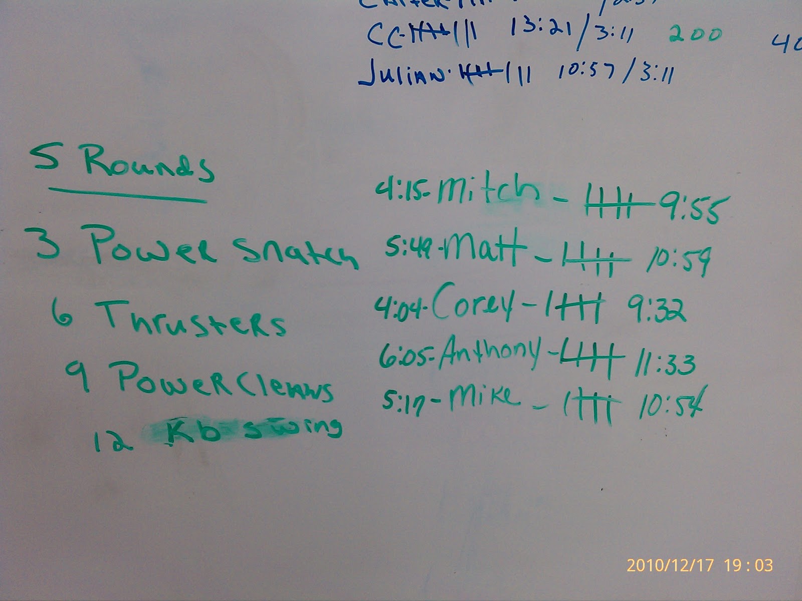 sep 5 & 7 pm class December 17, 2010 Lauren Uncategorized Comments Off on sep 5 & 7 pm class 5 rounds for time:3 power snatch (135/95)6 thruster (135/95)9 power clean (135/95) 12 pull-ups Related