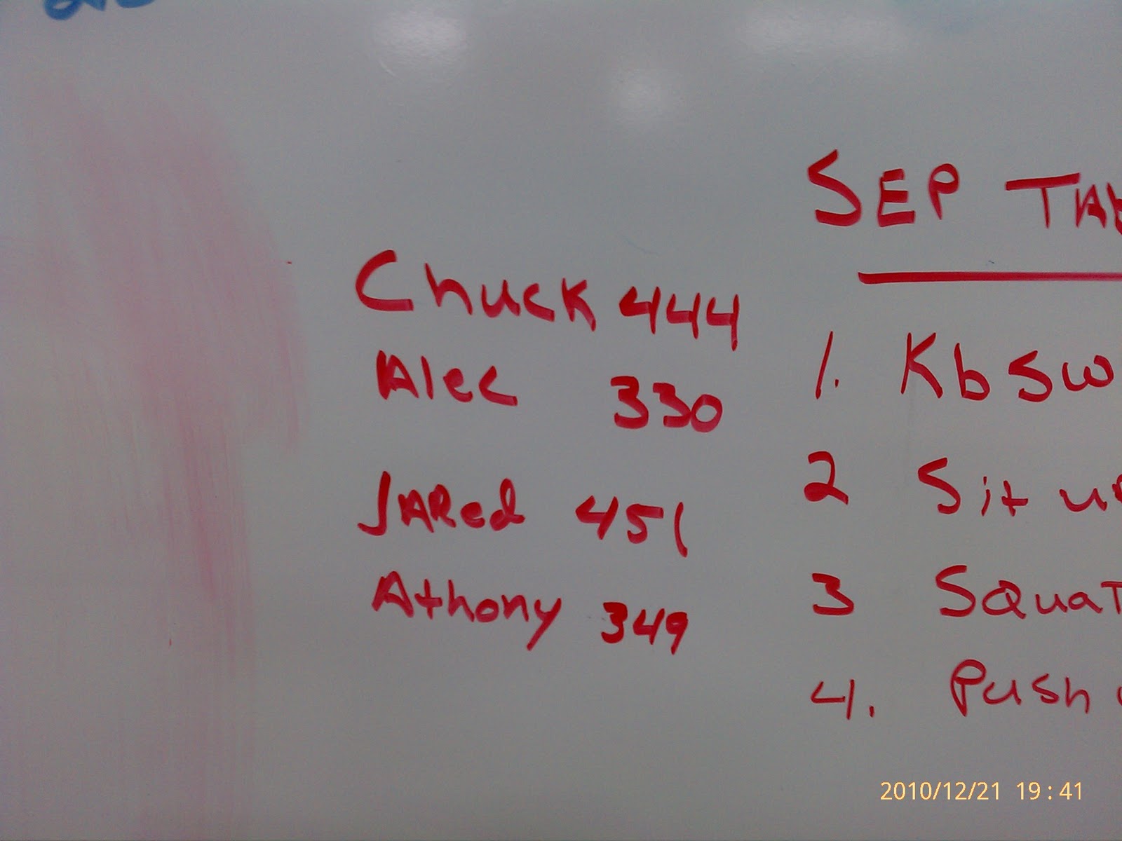 SEP December 21, 2010 Lauren Uncategorized 4 comments Tabata Intervals for reps:1. KB Swings 1.5/1.02. Sit-up (unanchored)3. Squat4. Push ups Related