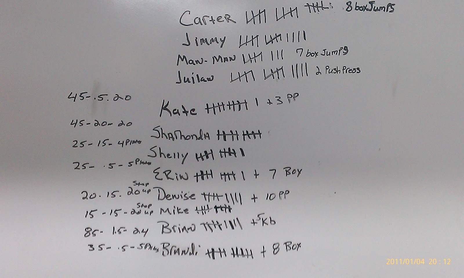 5am/ 6 pm January 3, 2011 Lauren Uncategorized Comments Off on 5am/ 6 pm Complete as many rounds as possible in 20 minutes of:115 pound Push press, 10 reps10 KB Swings, 1.5 pood10 Box jumps, 24 inch box Related