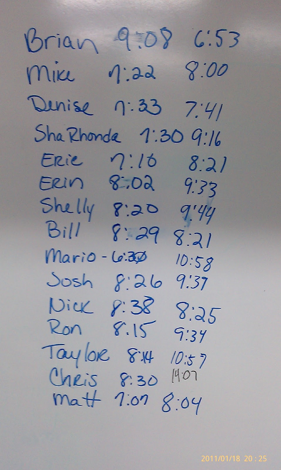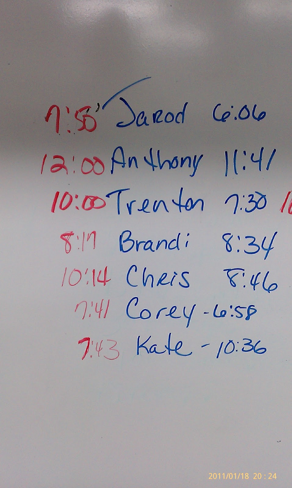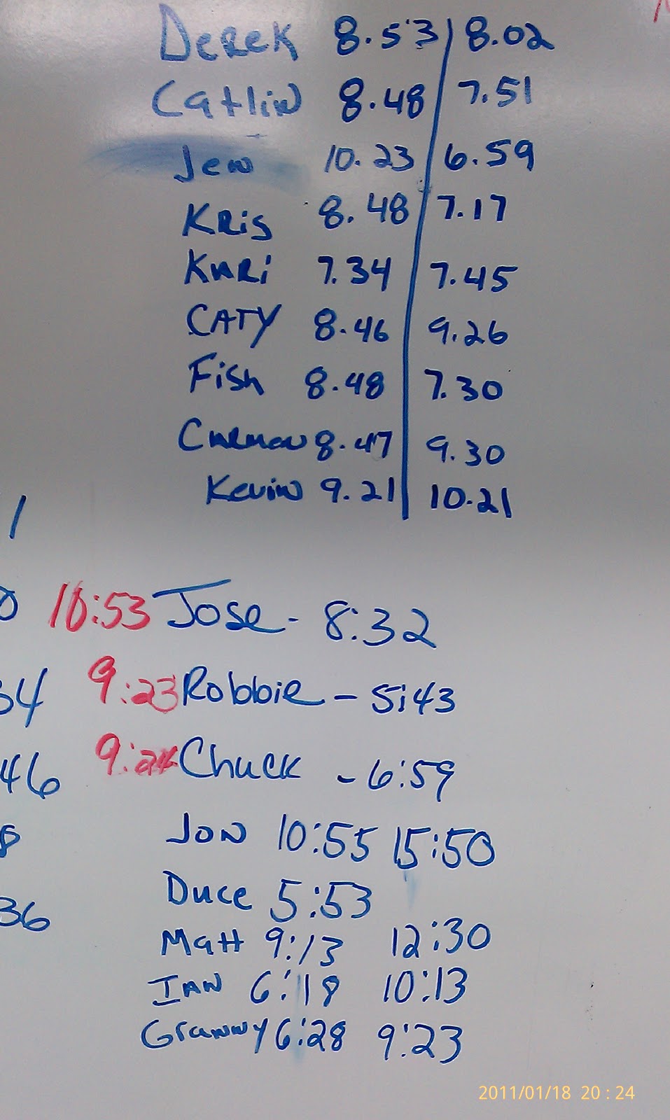 5am,6 pm sep, 5&7 January 17, 2011 Lauren Uncategorized One comment 21-15-9 reps for time of:Squat Cleans (135, 95)box dips Related
