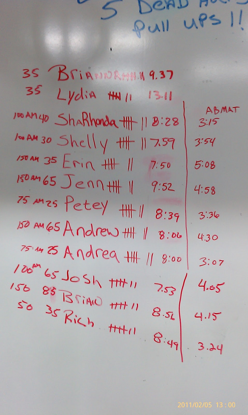 2/05/11 10 am & 11am class February 4, 2011 Lauren Uncategorized Comments Off on 2/05/11 10 am & 11am class WOD 7 rounds for time of: 10 Sumo-deadlift high-pull (95/65)(75/55)(65/35) 10 Ring dips Related