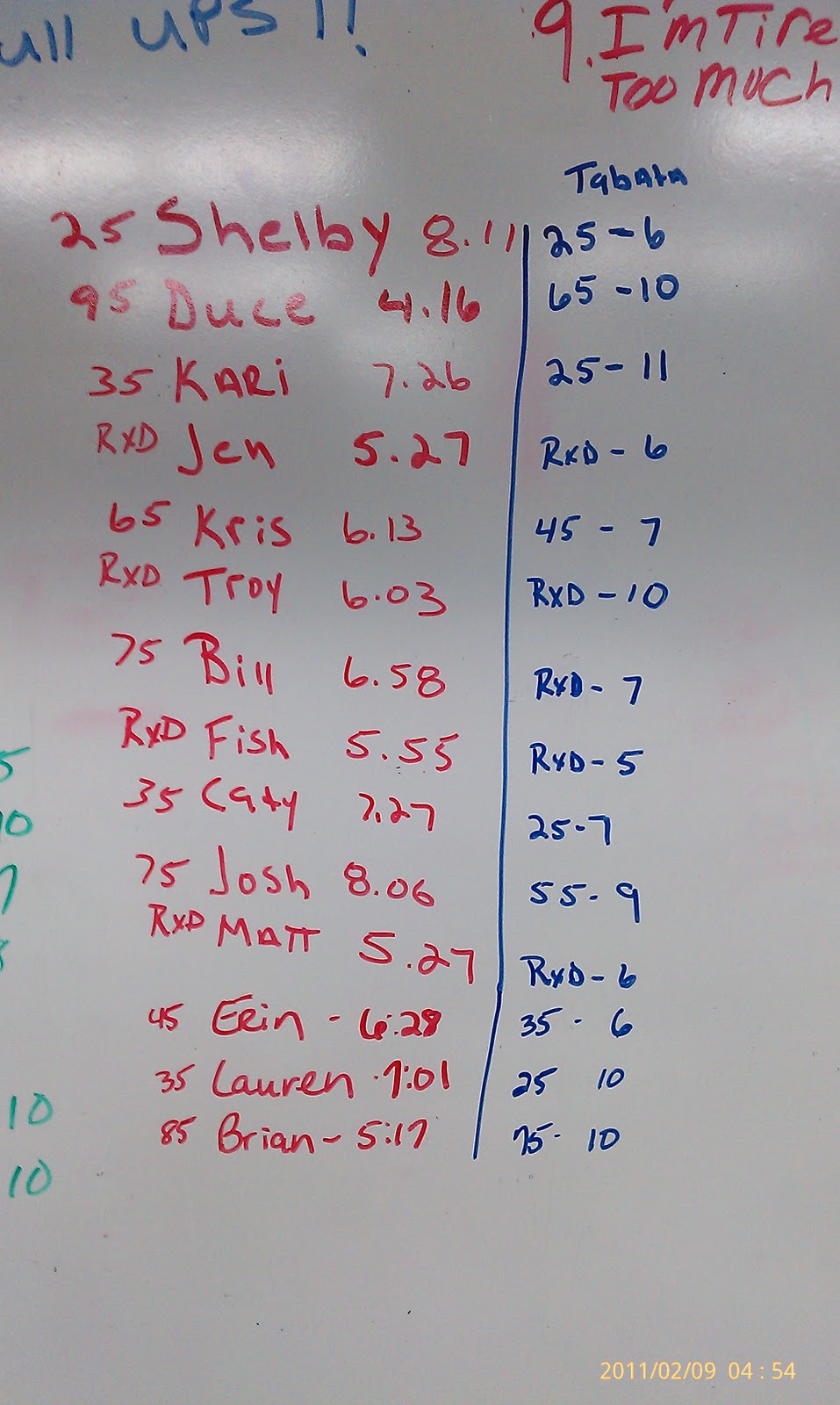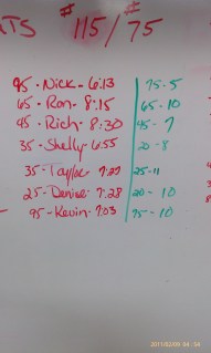 2/8/11 5AM,6AM, 5PM,6PM,7 PM February 7, 2011 Lauren Uncategorized Comments Off on 2/8/11 5AM,6AM, 5PM,6PM,7 PM 75 AbMat Situps 25 Front Squats (115/75) Demo 75 AbMat Situps Related