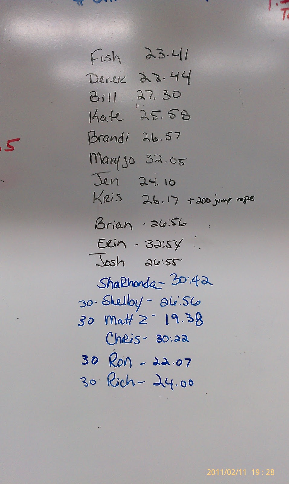 5am,6am,5pm,6pm,7pm February 10, 2011 Lauren Uncategorized Comments Off on 5am,6am,5pm,6pm,7pm For time: 50 Box jump, 24 inch box 50 Jumping pull-ups 50 Kettlebell swings (35, 25) 50 Walking Lunge steps 50 Knees to elbows 50 Push press (45, 35) 50 Back extensions 50 Wall ball shots (20, 14) 50 Burpees 50 Double unders Related