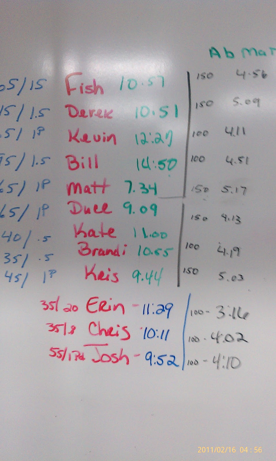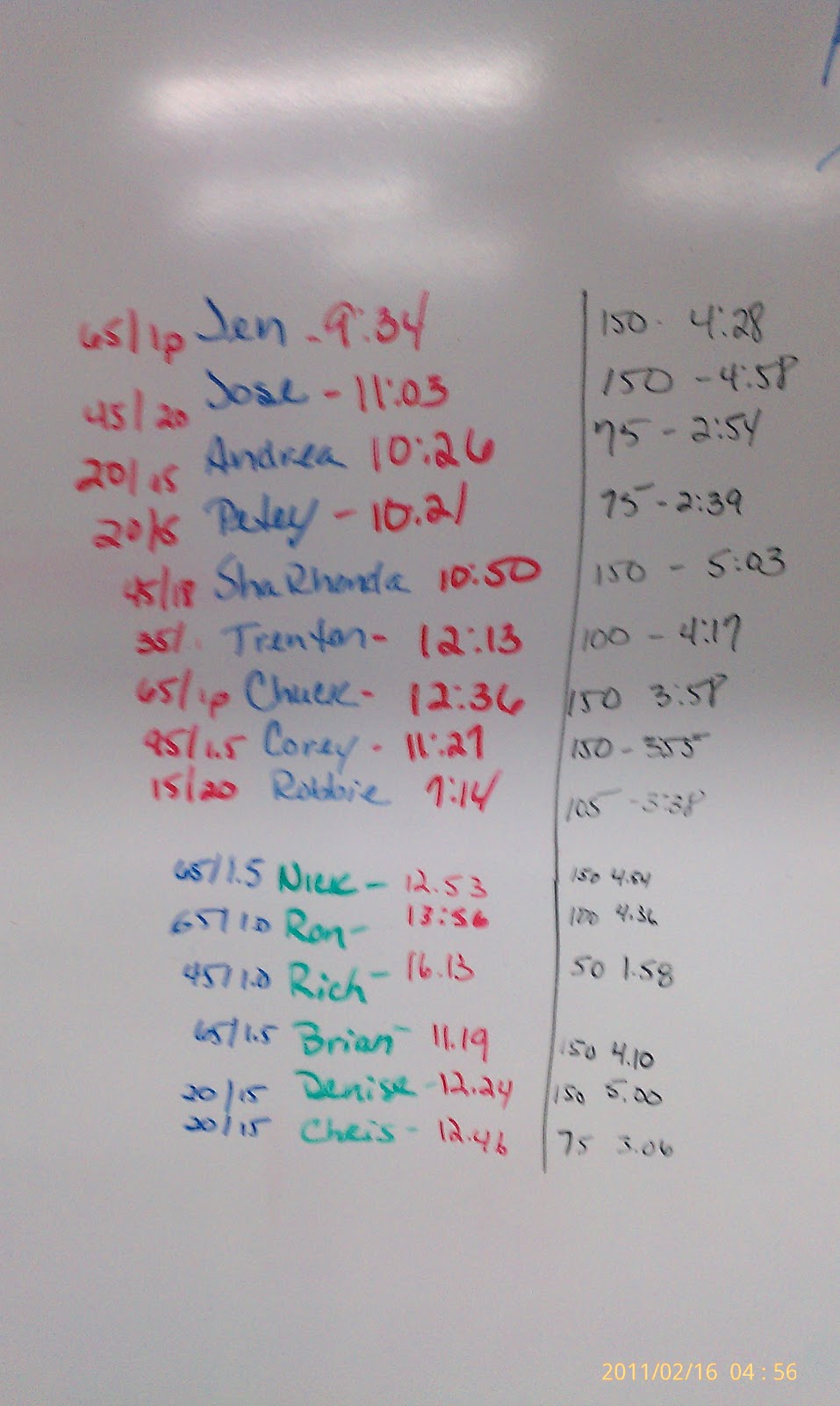 2- 15-11 5am, 6am , SEP 5PM, 6pm, SEP 7PM February 14, 2011 Lauren Uncategorized Comments Off on 2- 15-11 5am, 6am , SEP 5PM, 6pm, SEP 7PM Jen working the knees to elbows.. 21-15-9 Squat Clean(135/105) KB Swings(55/35) Ring Dips Related