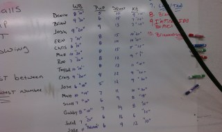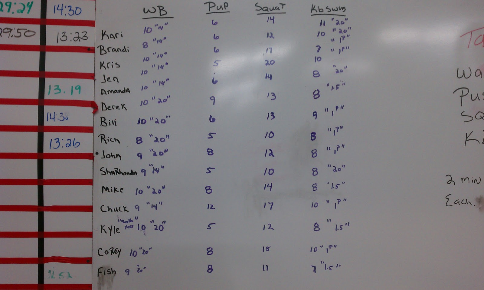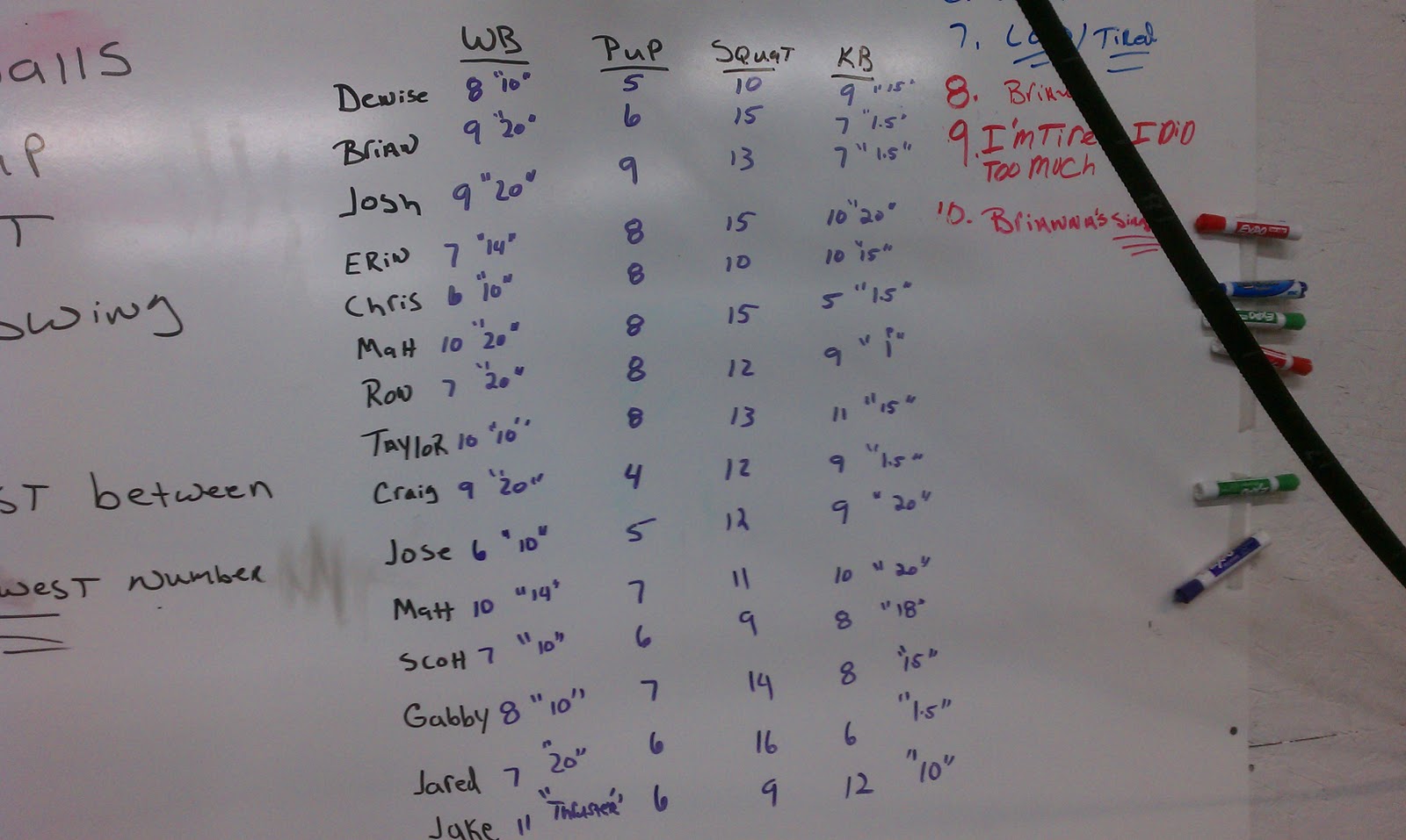 Total score: 55Wall ball:10 (15# at 9', heaviest the gym had, and a low ceiling too)Pushups: 15Squats: 20Kettlebells: 10 (50#)