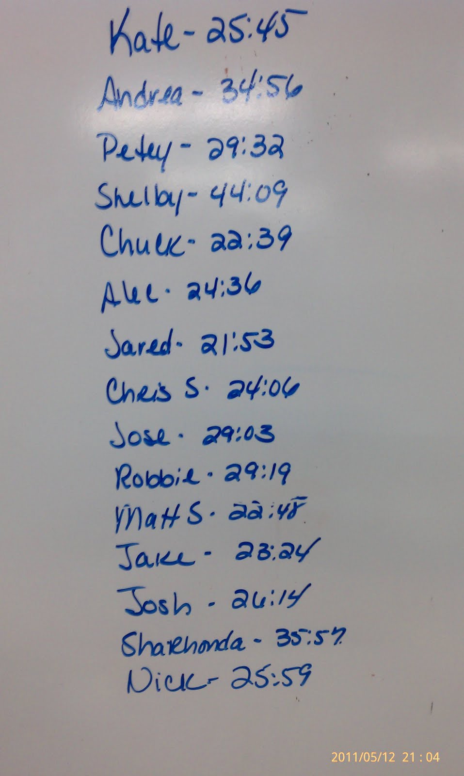 5am, 6am , SEP 5PM, 6pm, SEP 7PM May 12, 2011 Lauren Uncategorized Comments Off on 5am, 6am , SEP 5PM, 6pm, SEP 7PM run a 5k”3.1 miles” for time Related