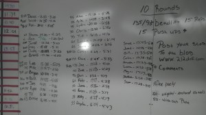 This is a blast from the past! We did this workout at the old gym on 10/02/10. My time was 13:49 at 95lbs. I did the pushup from the knees every other round for the first 6 rounds and stayed on my knees for the last 4. Curious to know how I would do today but I’m still home attempting to get over this crap in my lungs! I’ll try to squeeze this in sometime this week. Peace out homies!