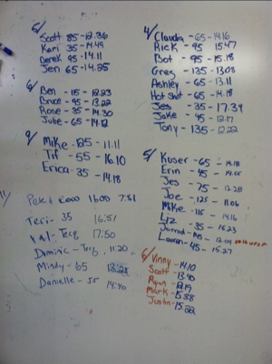 Am 5,6,9,11 PM 4,5,6 August 13, 2012 lumpy6488 Uncategorized Comments Off on Am 5,6,9,11 PM 4,5,6 Squat cleans 3 on the min for 9 mins. use 75% of last weeks weight “August 7, 2012” WOD Three rounds for time of: Row 500 meters Run 400 meters Related
