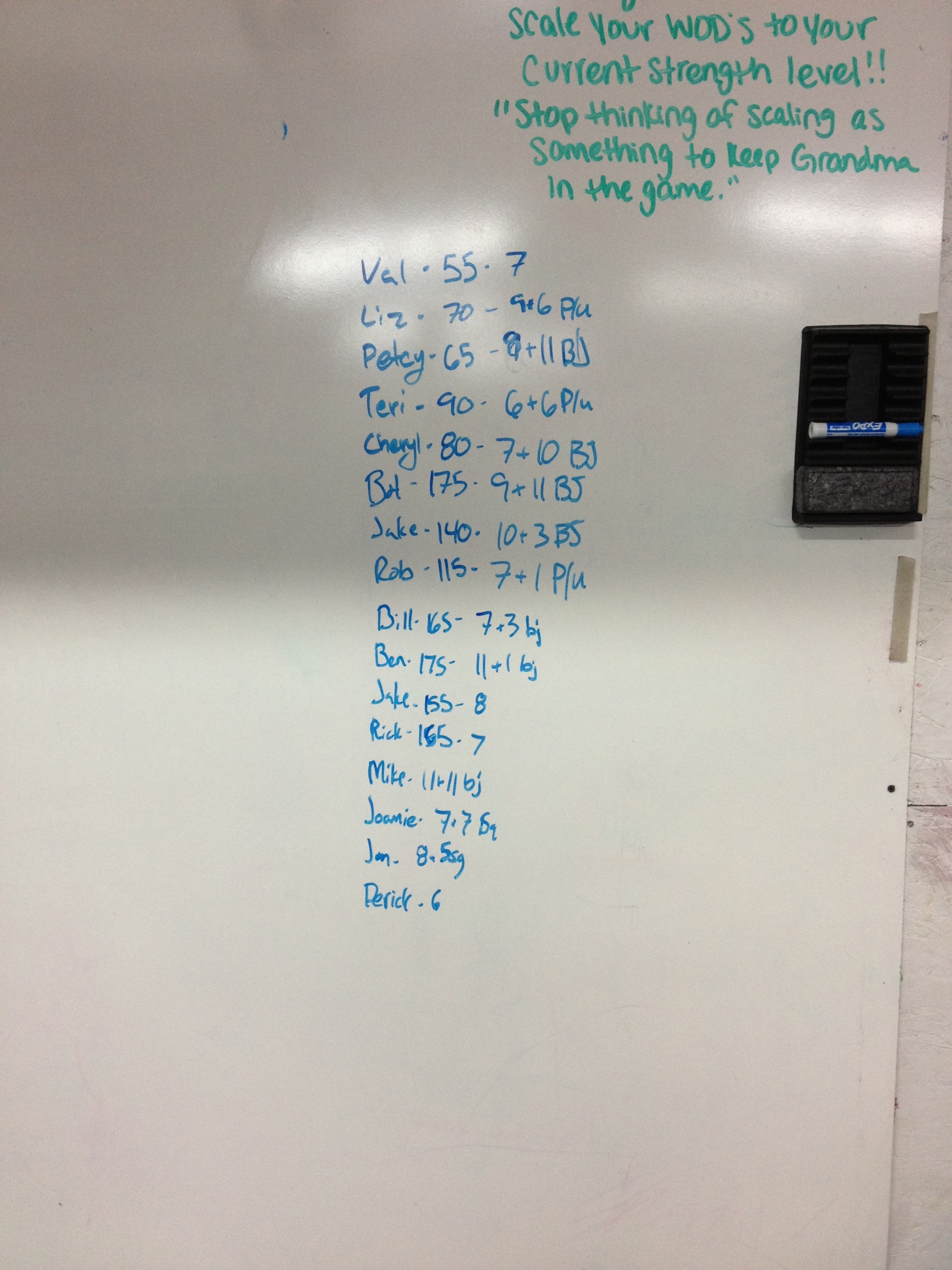 Am 5,6,9,11 pm 4,5,6 October 7, 2012 lumpy6488 Uncategorized Comments Off on Am 5,6,9,11 pm 4,5,6 Exercise: Thruster/lbs Reps: 1-1-1 Comment: 7 sets (new set every 2:00 minutes) Thruster complex 1- Front squat 1- Push press 1- Thruster AMRAP in 15 minutes of: 7 pull ups 11 box jumps ( 24″/20″) 15 air squats Related