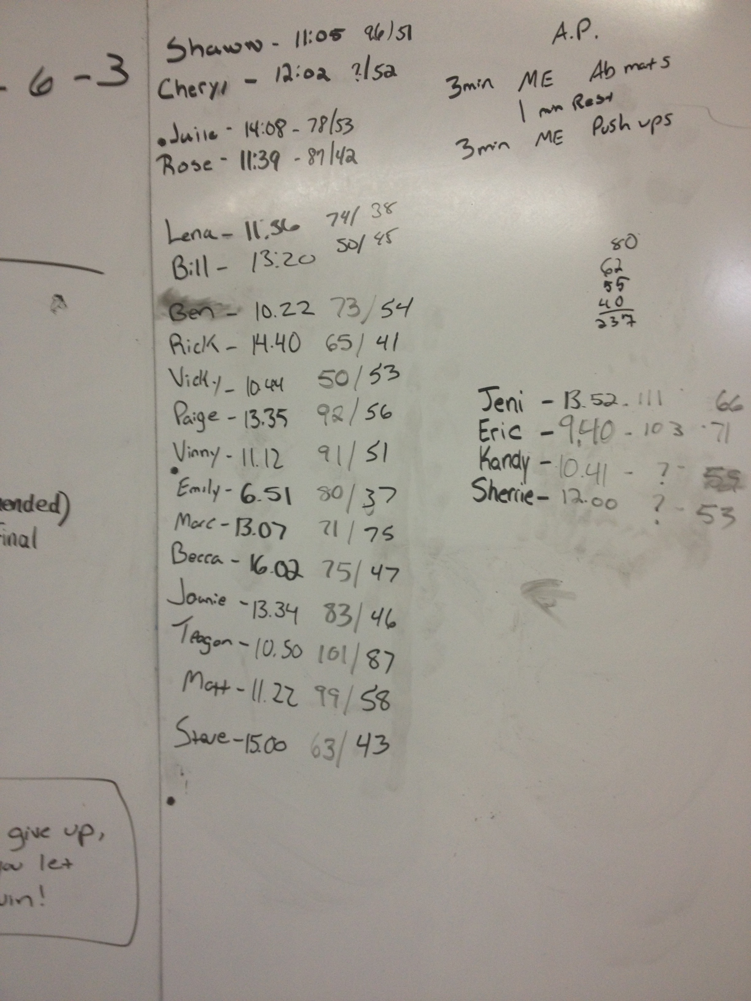 Am 5,6,9,11 pm 4,5,6 October 24, 2012 lumpy6488 Uncategorized Comments Off on Am 5,6,9,11 pm 4,5,6 21 – 18 – 15 – 12 – 9 – 6 – 3 Reps for time of: Sumo deadlift high pull, 75# (55#) Thrusters, 75# (55#) Related