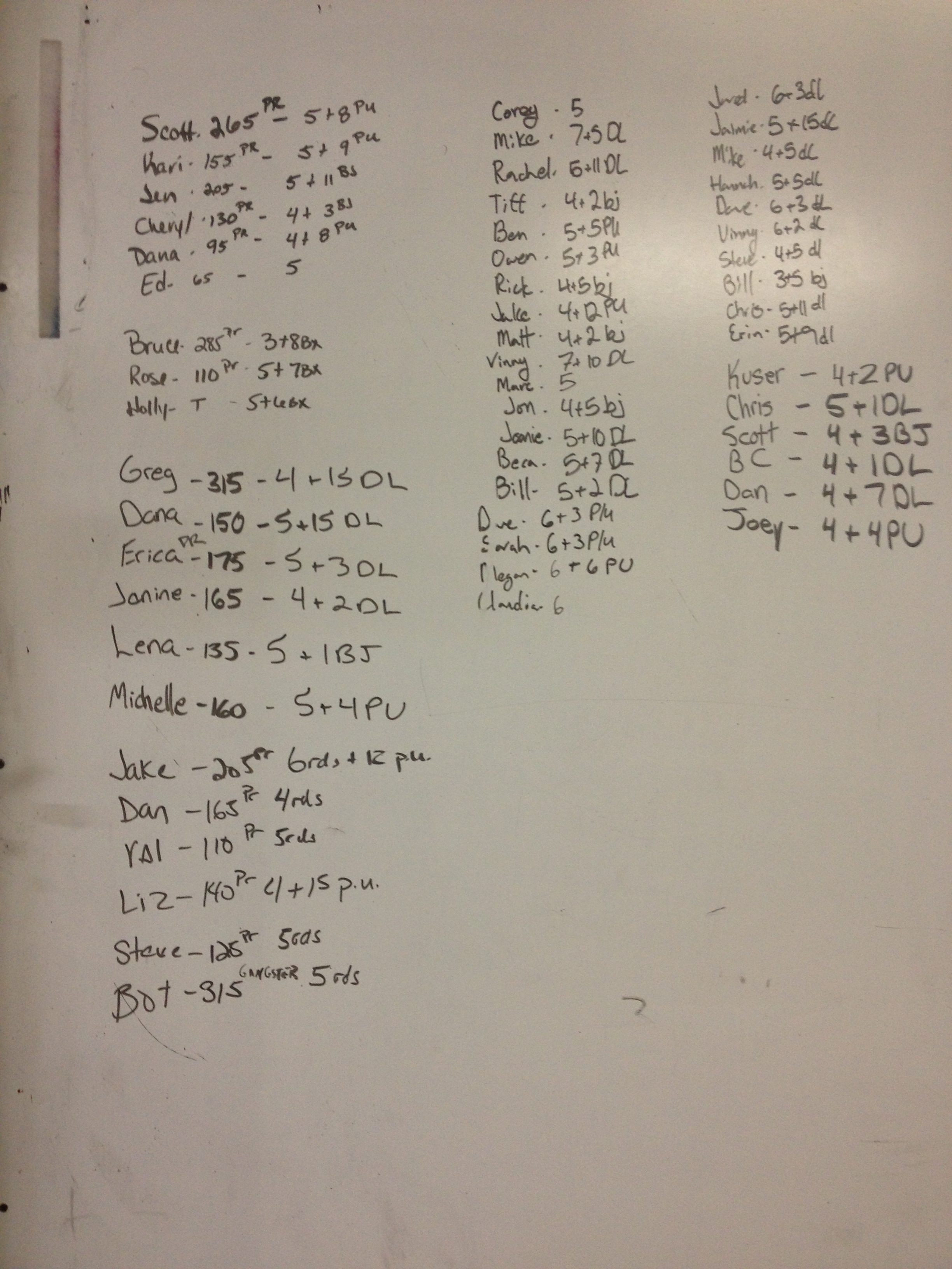Am 5,6,9,11 pm 4,5,6 December 17, 2012 lumpy6488 Uncategorized Comments Off on Am 5,6,9,11 pm 4,5,6 20 mins Find your 1 rep max back squat WOD 12 min AMRAP 155 / 110 dead lift 15 reps 15 deficit push ups on 25lb plates 15 box jumps 24″/ 20″ Related