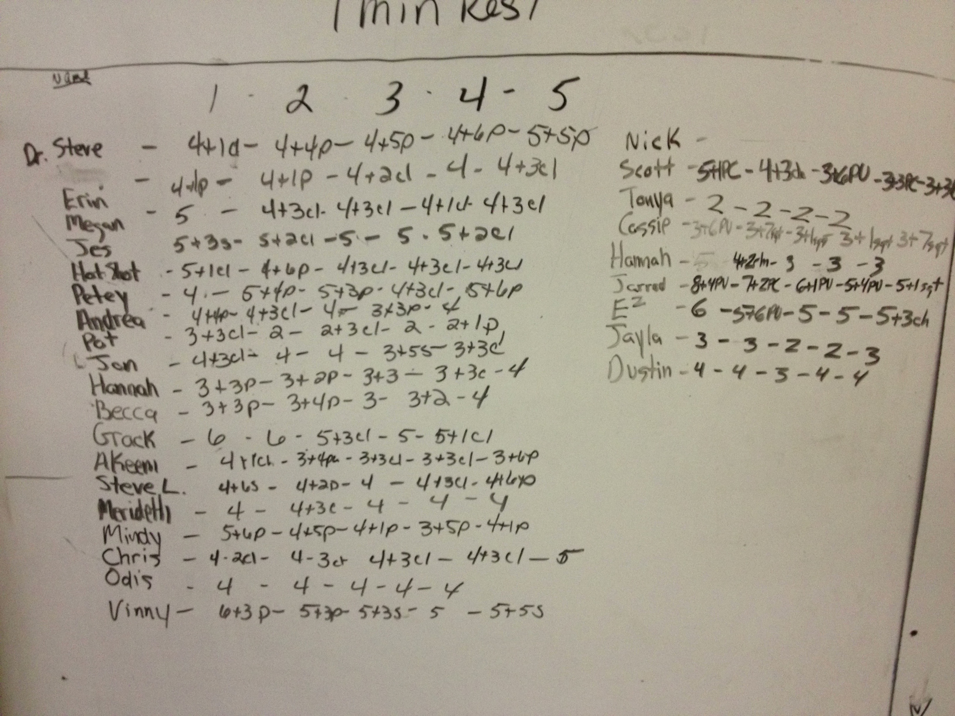 Am 5,6,9,11 pm 4,5,6 January 15, 2013 lumpy6488 Uncategorized Comments Off on Am 5,6,9,11 pm 4,5,6 3x ME hsp 1 min rest WOD Chief 5 rounds of: 3 min AMRAP 3 power cleans 135-96 6 push ups 9 air squats Related