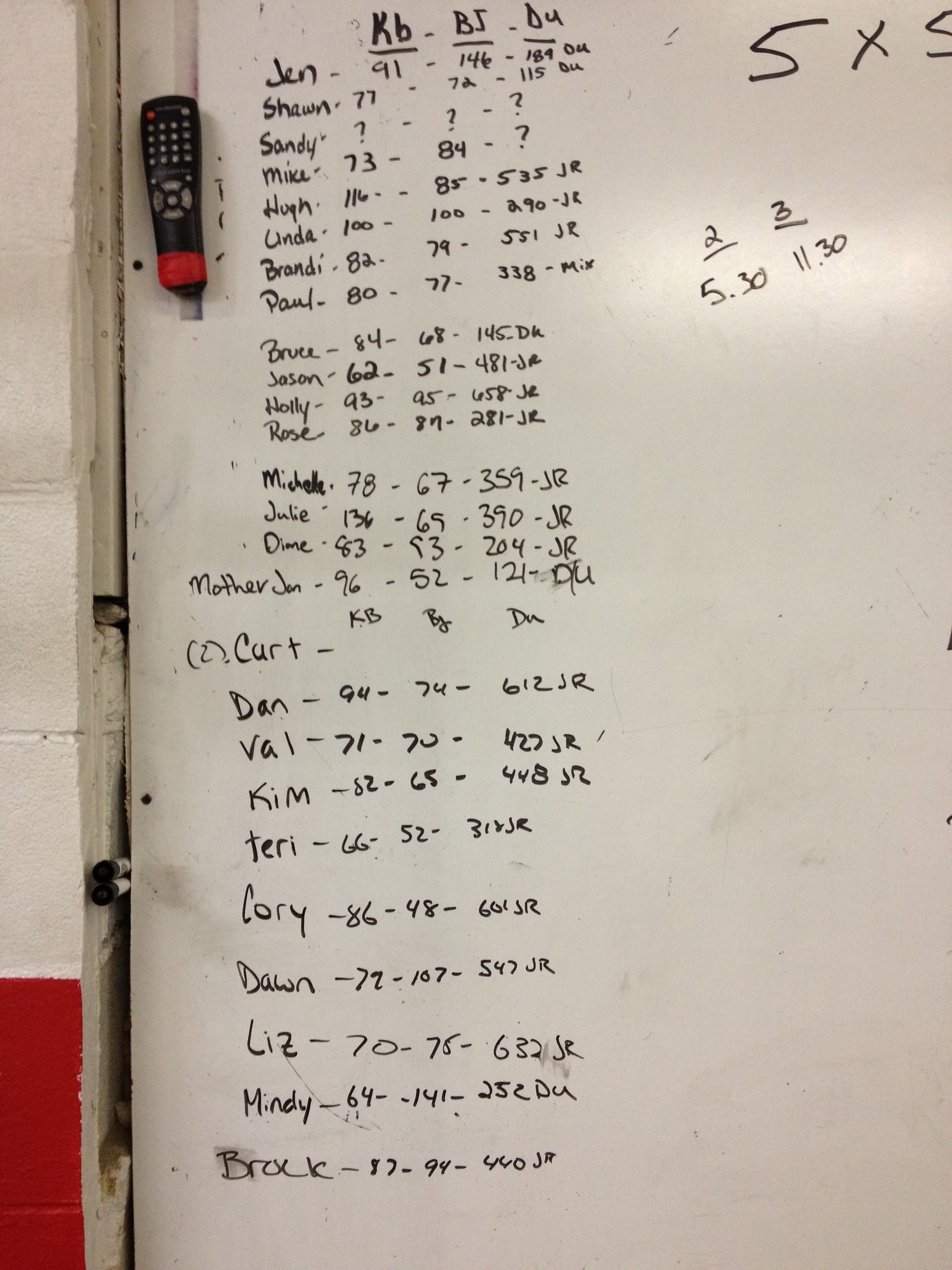 Am 5,6,9,11 Pm 4,5,6 February 7, 2013 lumpy6488 Uncategorized Comments Off on Am 5,6,9,11 Pm 4,5,6 Shoulder press 5×2 H.a.t.a WOD For time 40 med ball cleans 50 walking lunges holding ball on chest 60 Wall ball ab mats 50 walking lunges w/ ball 40 med ball cleans Related