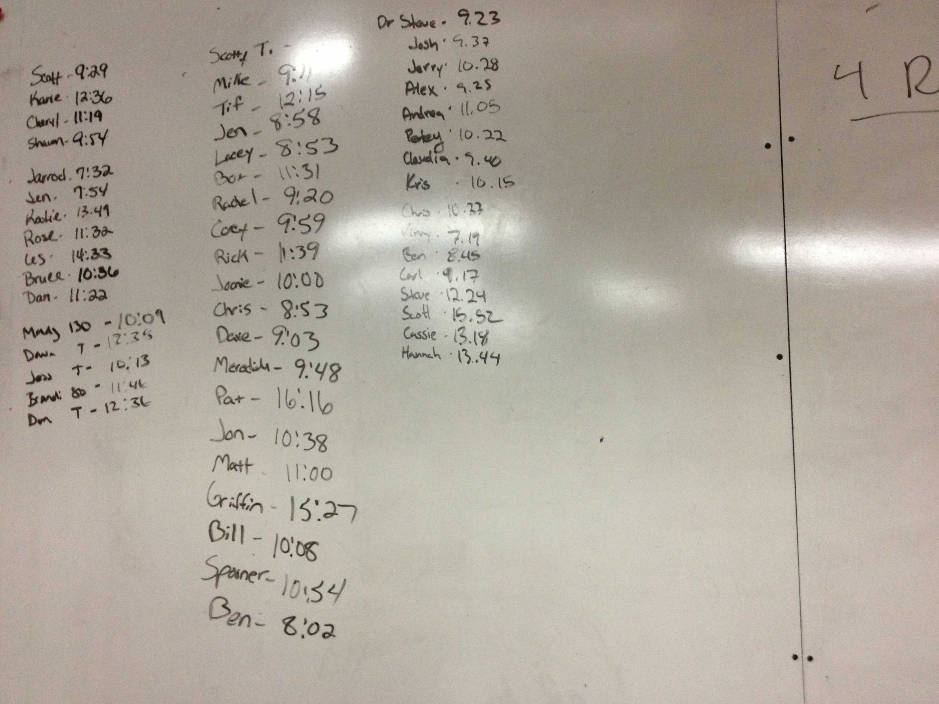 Am 5,6,9,11 pm 4,5,6 February 28, 2013 lumpy6488 Uncategorized Comments Off on Am 5,6,9,11 pm 4,5,6 15 mins find 1 rep power clean 10 min skill Kb snatch WOD 4 rounds 32 split Jumps alternating 16 kb snatch 8 each hand 12 pull ups Related