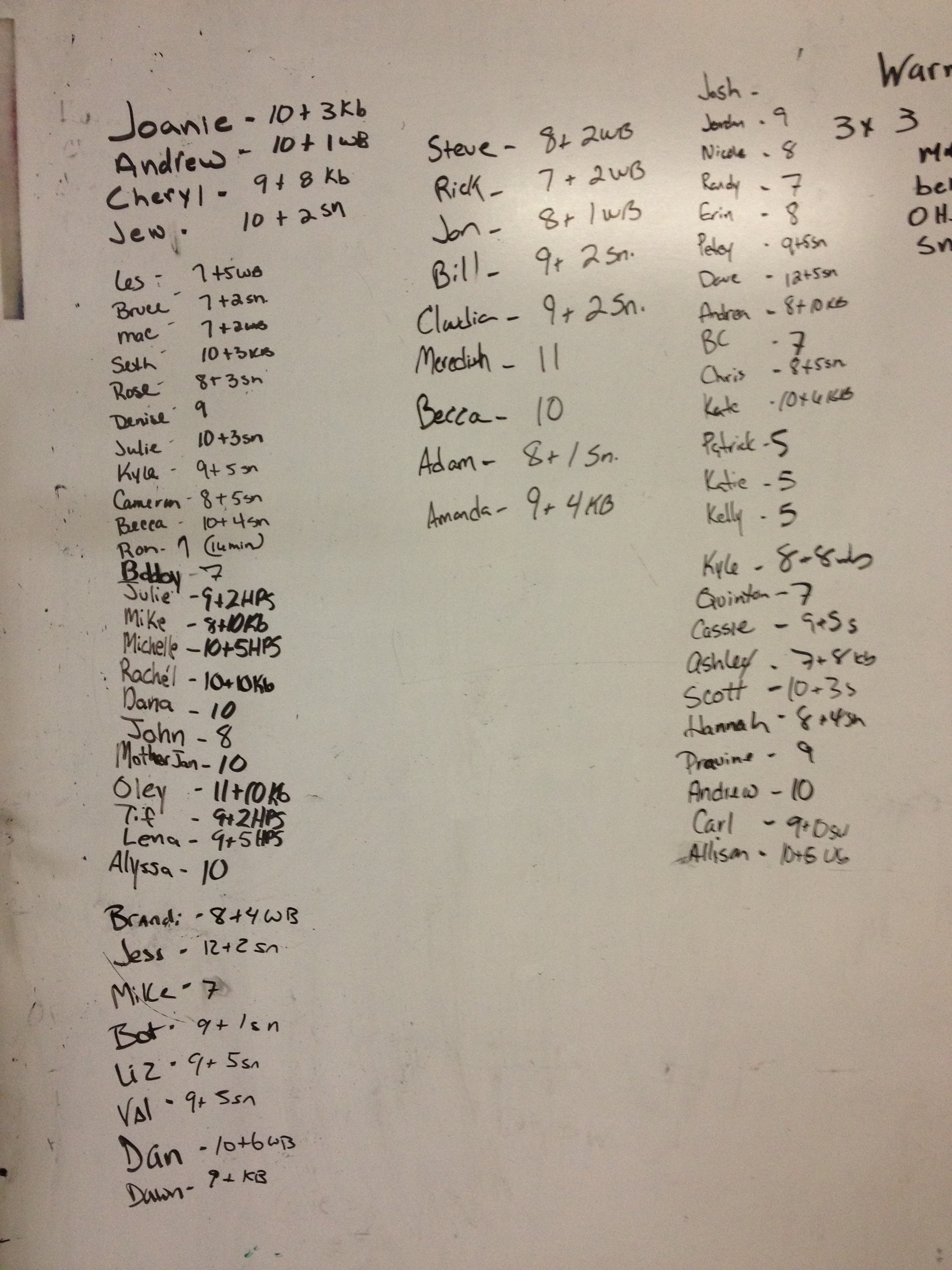 Am 5,6,9,11 pm 4,5,6 April 1, 2013 lumpy6488 Uncategorized Comments Off on Am 5,6,9,11 pm 4,5,6 7×1 1 power snatch from the hip + 1 full snatch From above the knees 90 sec rest 20min AMRAP 5 hang Power Snatch 75/95 10 Russian swings 2/1.5 15 Wall Bal.zzf a Related