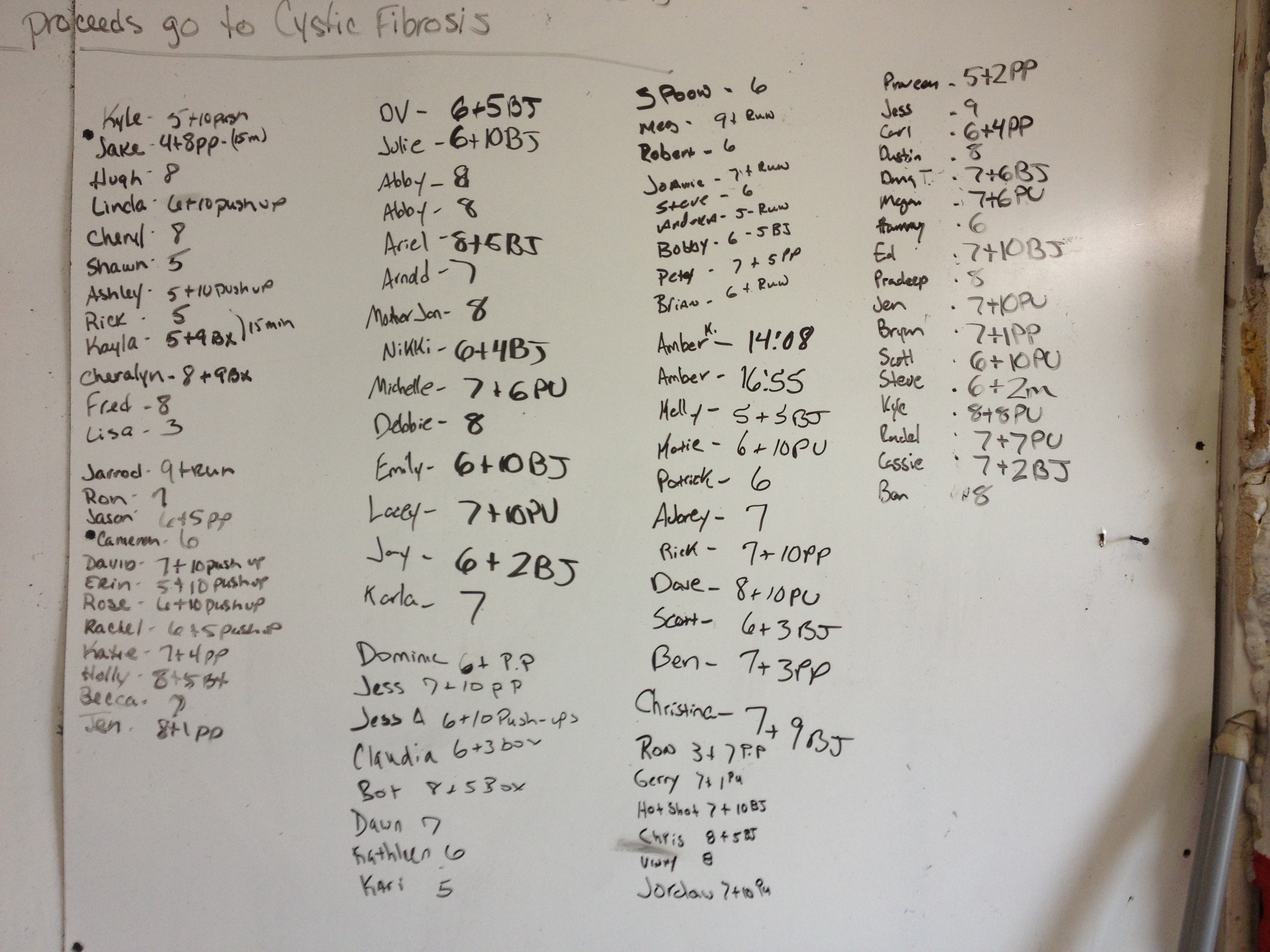 Am 5,6,9,11 pm 3,4,5,6 May 14, 2013 lumpy6488 Uncategorized Comments Off on Am 5,6,9,11 pm 3,4,5,6 20 min Amrap 10 Push Press (115#/75#) 10 Box jumps (24″/20″) 10 Push ups 200m sprint Related