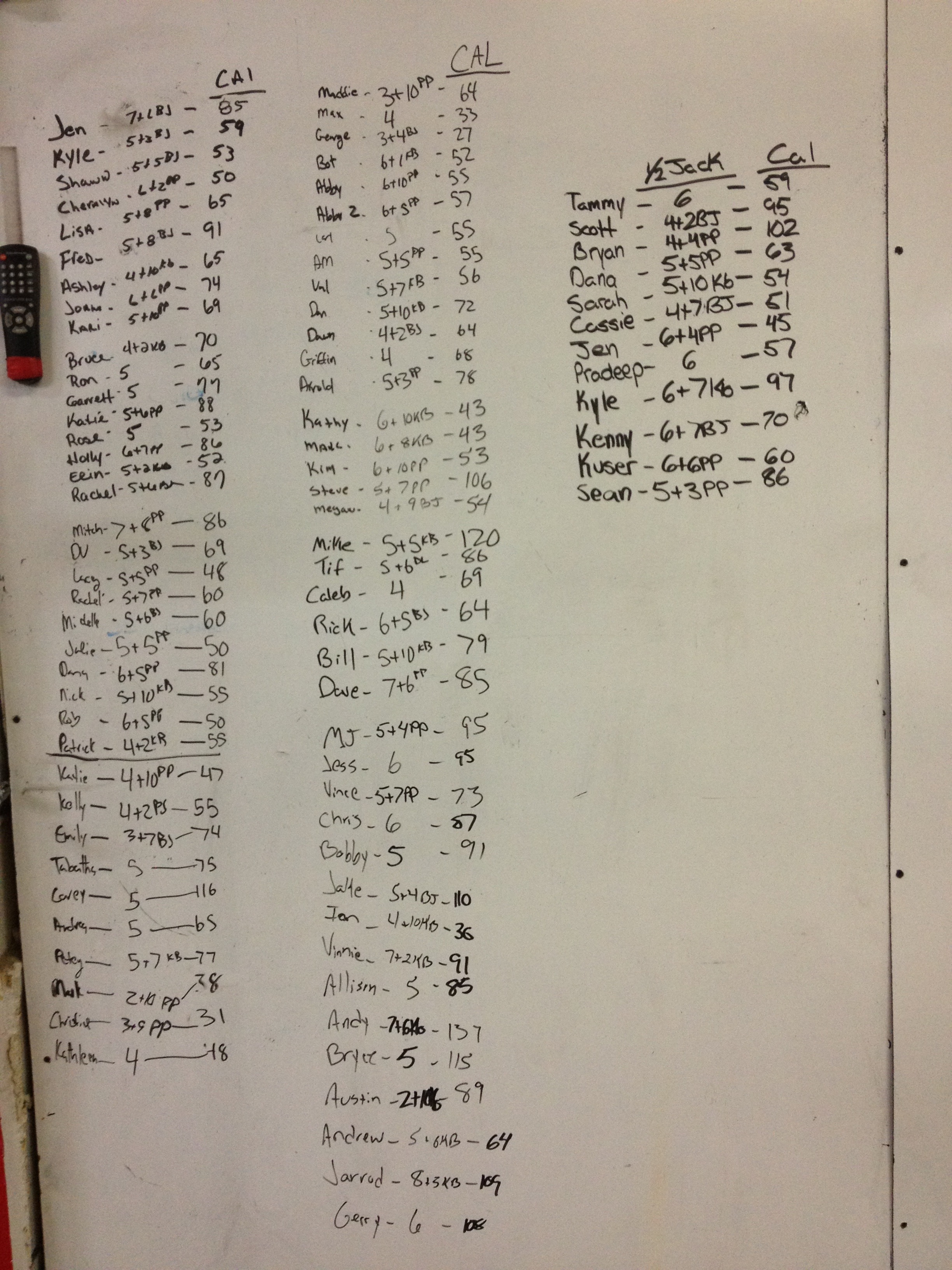 Am5,6,9,11 pm 3,4,5,6 June 11, 2013 lumpy6488 Uncategorized Comments Off on Am5,6,9,11 pm 3,4,5,6 MetCon “1/2 Jack” 10 min AMRAP 10 Push Press 115/75 10 KB Swing 1.5/1 pood 10 Box Jump 24/20 5 min rest 10 min 75 wallballs Max calorie rowed with remaining time. Score is calories Related